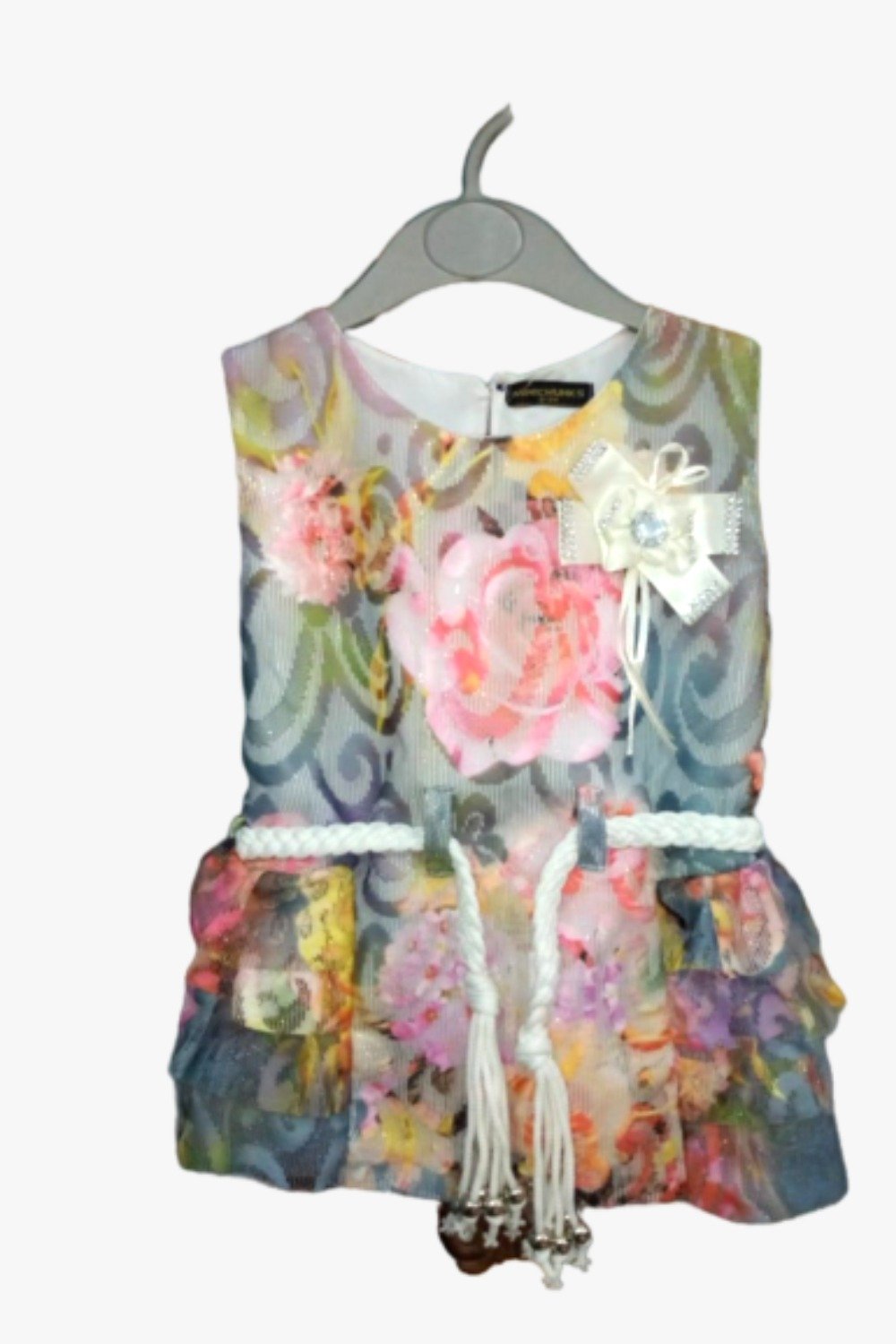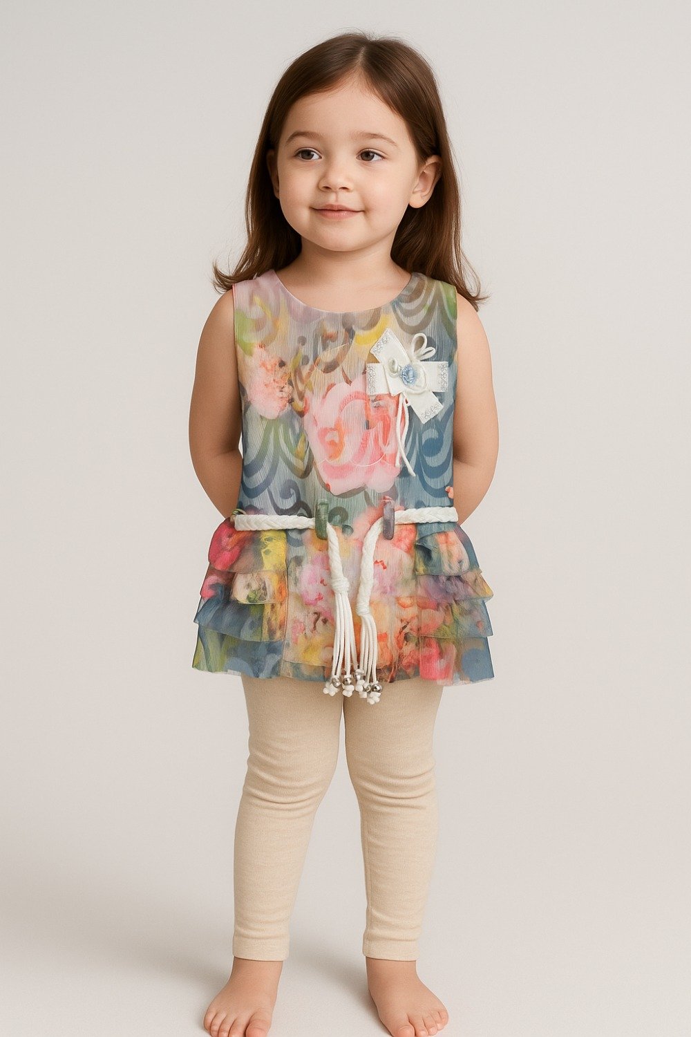 vibrant digital full-print design, featuring frill detailing at the bottom and a braided cord with pearls for a charming finish.